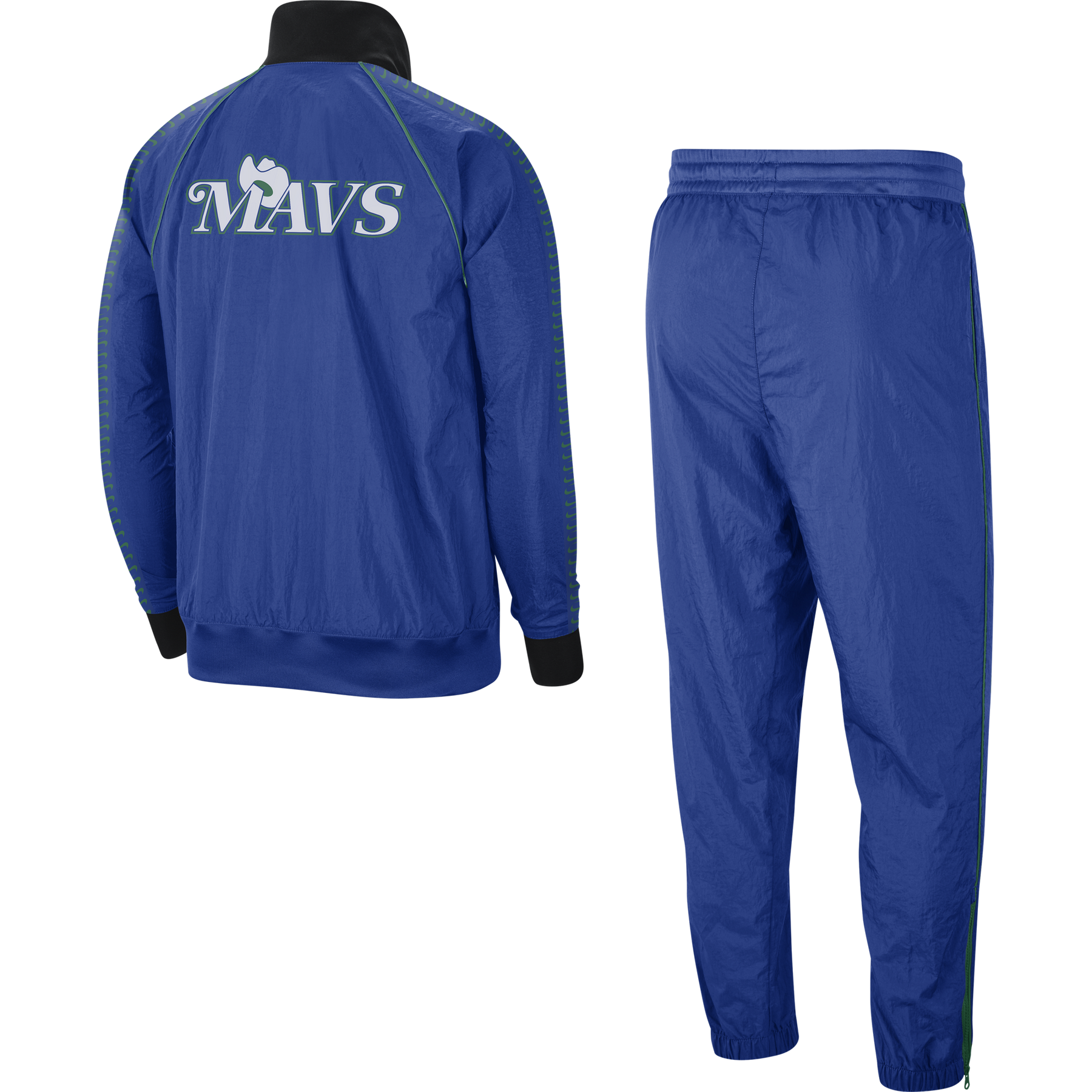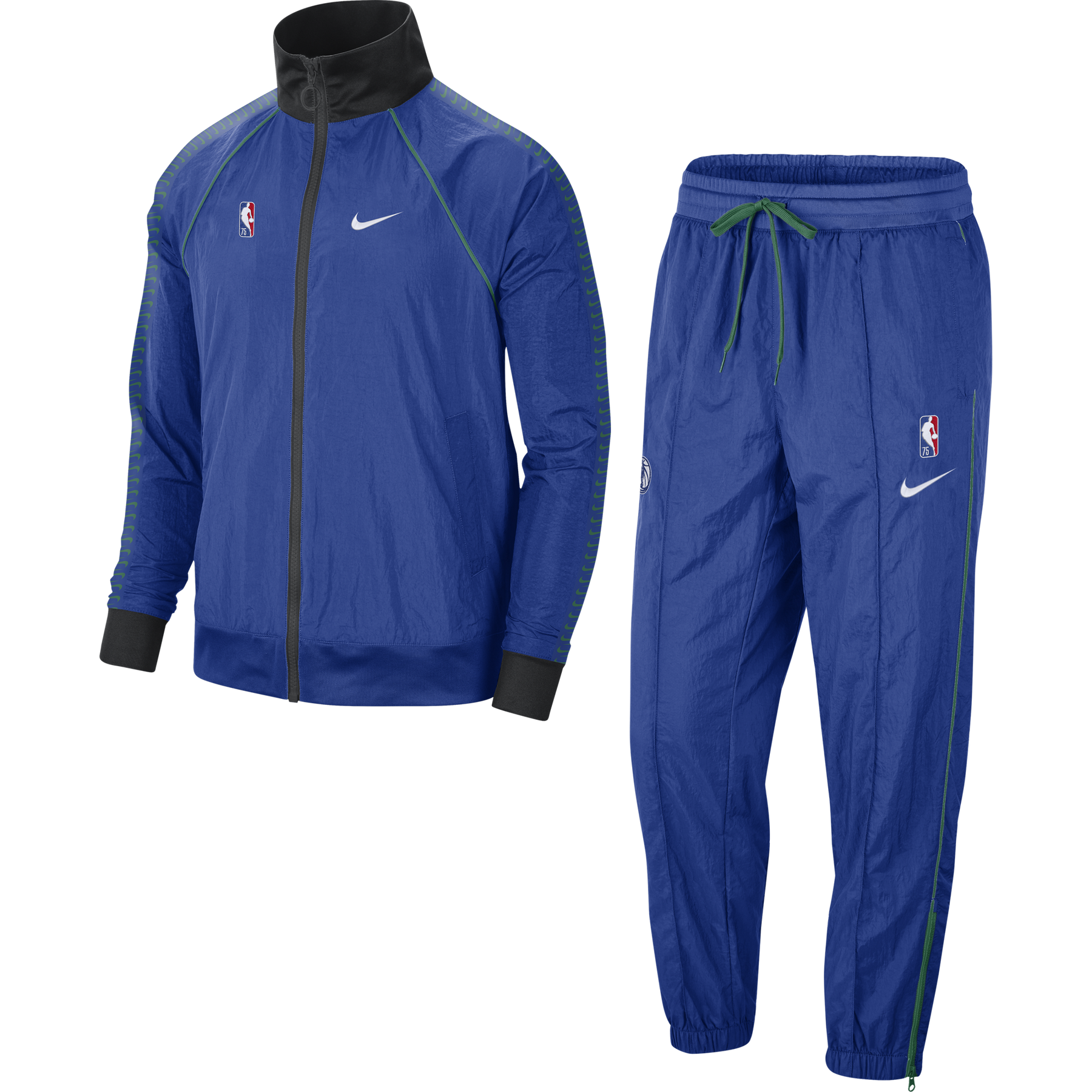 Move to the beat of the NBA in the Dallas Mavericks Courtside Nike Tracksuit. Made from crinkly woven materials, it's lined with comfortable mesh and embellished with a mix of print and embroidery, piping detail and graphic tape along the shoulders. Colors hook to the team's new Mixtape Edition uniform—a new offering for the league's 75th anniversary season.